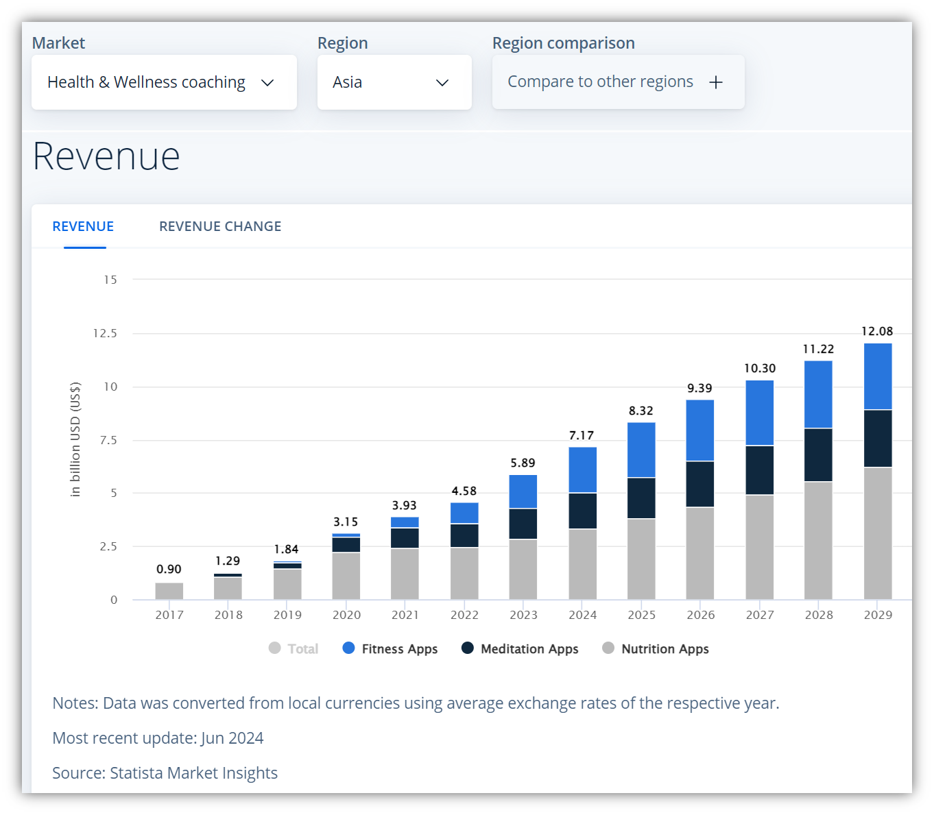 The Health & Wellness coaching market in Asia is projected to grow by 11.03% (2024-2029), with the revenue in the market being projected to reach US$7.16 billion in 2024 (Statista)